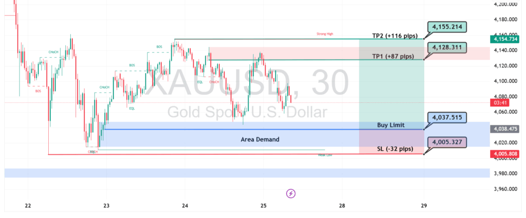Sentimen pasar saat ini cenderung positif terhadap aset berisiko, namun emas tetap menarik bagi trader yang mencari peluang jangka pendek. Strategi buy limit di area demand menjadi opsi menarik, dengan stop loss ketat di sekitar $4.005 untuk menjaga risiko tetap terukur. Rasio risk-to-reward yang ideal membuat setup ini diminati kalangan trader teknikal.