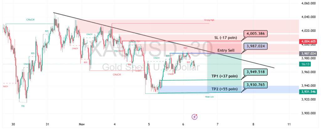 Skenario entry sell tampak ideal di kisaran 3.987, dengan stop loss ketat di 4.005.386 untuk menjaga rasio risiko yang efisien. Target profit pertama (TP1) berada di 3.949.518, sementara TP2 di 3.930.765 menawarkan potensi keuntungan lebih besar seiring berlanjutnya tekanan jual. Struktur pasar menunjukkan break of structure (BOS) yang memperkuat bias bearish jangka pendek.