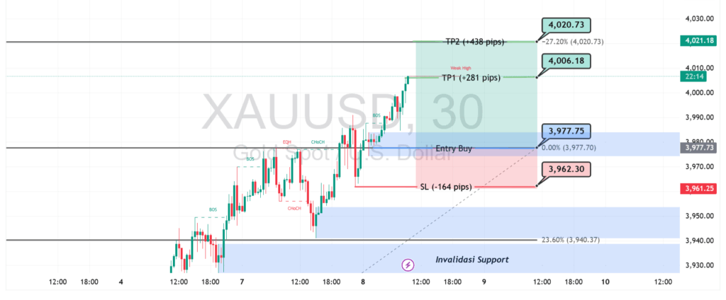Harga emas (XAU/USD) terus menunjukkan kekuatan dengan menembus area konsolidasi dan kini bergerak di atas level psikologis $4.000 per ons. Struktur harga masih mendukung tren naik setelah terjadi break of structure (BOS), menandakan dominasi pembeli masih kuat. Posisi beli di sekitar $3.977 tetap relevan, dengan area tersebut kini menjadi support penting dalam menjaga momentum bullish.
