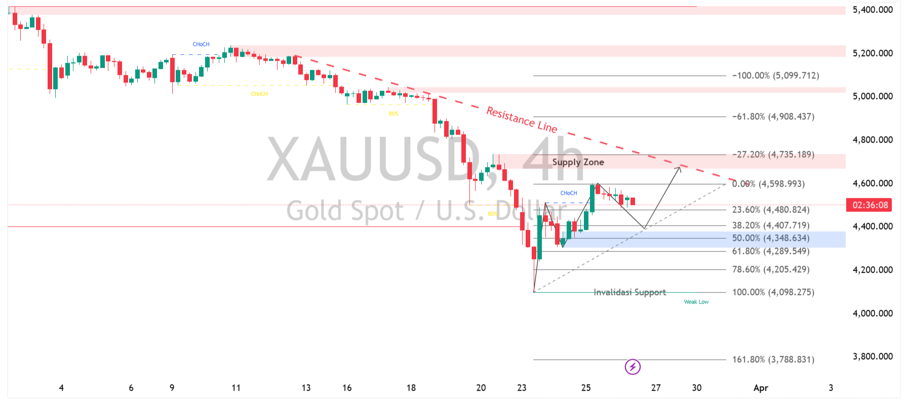 Saat ini harga bergerak di sekitar area retracement Fibonacci 23,6% hingga 38,2%, yang menjadi zona krusial untuk menentukan arah berikutnya. Jika terjadi pullback lebih dalam ke area 4.400 – 4.350 (sekitar 50% – 61,8%), potensi reaksi bullish jangka pendek bisa muncul. Namun, selama harga tetap di bawah resistance dinamis, tekanan jual masih mendominasi dan berisiko mendorong harga kembali turun.