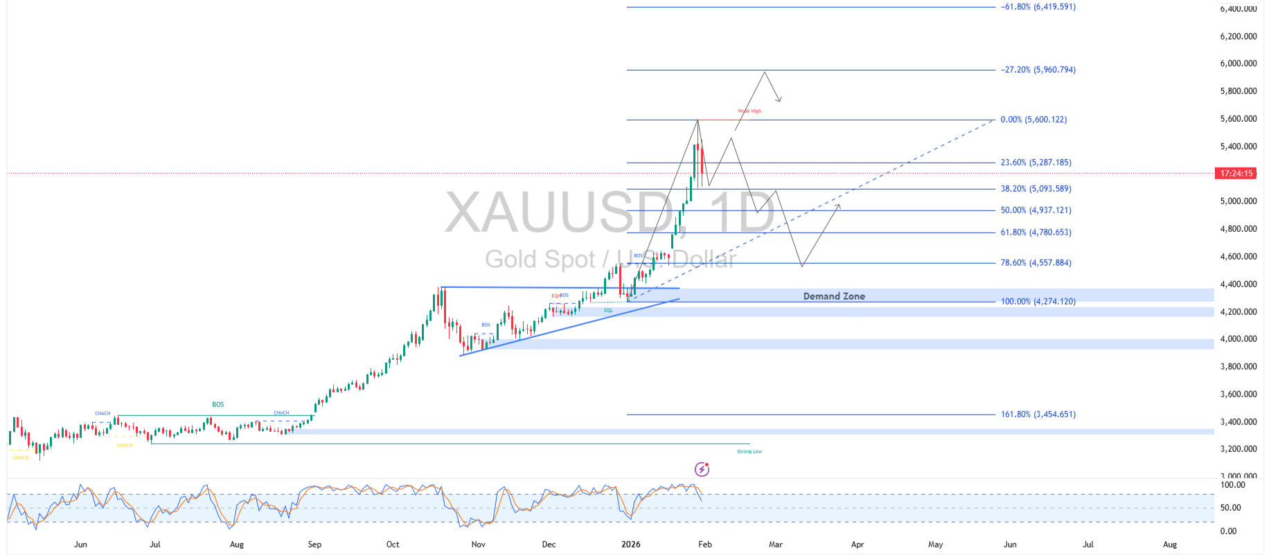 Secara teknikal, XAUUSD pada timeframe harian masih berada dalam tren naik kuat setelah mencetak lonjakan signifikan dari area demand. Namun, munculnya penolakan di area puncak terbaru mengindikasikan potensi fase konsolidasi jangka menengah, seiring harga gagal mempertahankan momentum di zona atas Fibonacci.