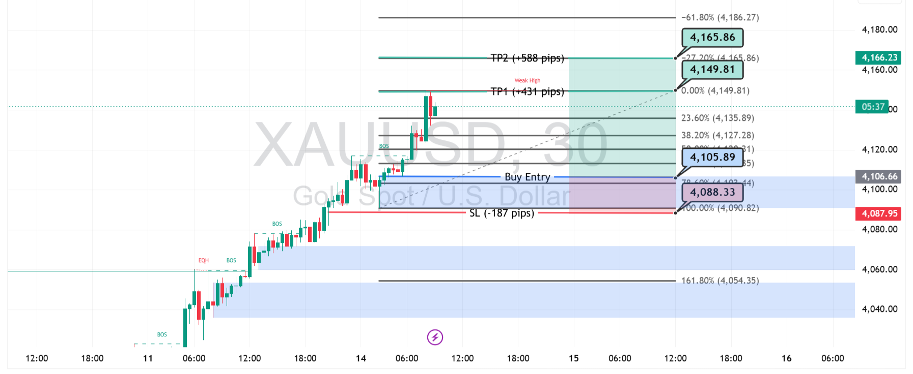 Emas (XAUUSD) pada timeframe M30 sedang menunjukkan tren kenaikan yang sangat jelas, didukung oleh serangkaian Break of Structure (BOS) yang mengindikasikan dominasi pembeli yang berkelanjutan. Setelah mencapai level puncak (Weak High) di sekitar $4.149,81, saat ini harga diperkirakan akan melakukan koreksi sehat (pullback) menuju zona permintaan sebelum melanjutkan pergerakan bullish. Koreksi ini adalah peluang utama untuk masuk pasar.