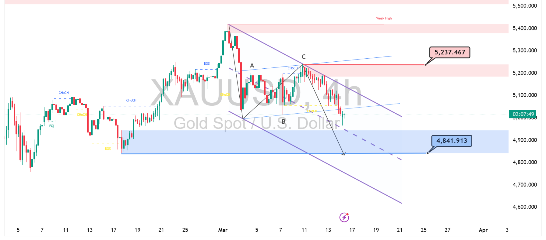Apabila tekanan jual berlanjut dan support terdekat tidak mampu bertahan, harga emas berpotensi bergerak menuju area demand berikutnya di sekitar 4.841. Zona ini menjadi target penurunan yang cukup signifikan karena sebelumnya berfungsi sebagai area akumulasi kuat. Pergerakan menuju level tersebut akan menentukan apakah pasar hanya mengalami koreksi sementara atau mulai memasuki fase penurunan yang lebih luas.