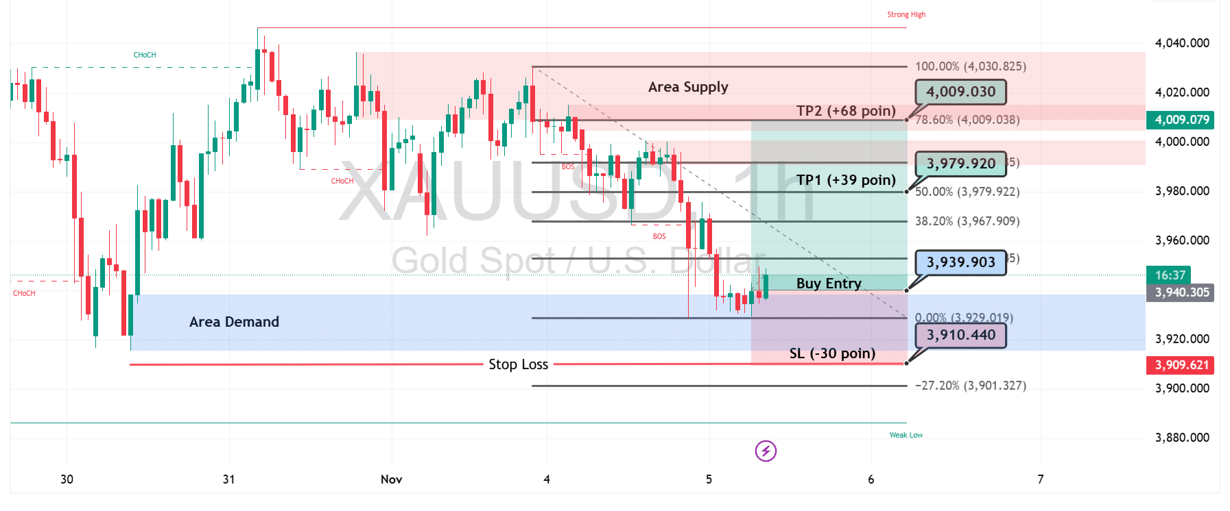 Peluang beli (buy entry) terlihat di kisaran 3.939 USD, dengan target pertama (TP1) di 3.979 USD dan target kedua (TP2) di 4.009 USD. Jika harga terus menguat dan mampu menembus area supply di atas 4.000 USD, maka potensi kenaikan bisa berlanjut lebih tinggi. Namun, jika harga turun di bawah stop loss (SL) di 3.910 USD, tren naik ini bisa gagal dan harga mungkin bergerak ke 3.900 USD.