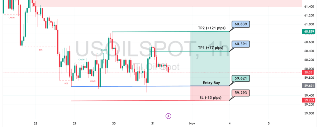 Harga minyak WTI menunjukkan potensi pembalikan arah setelah membentuk area konsolidasi kuat di sekitar level 59.60. Tekanan jual sebelumnya tampak mulai melemah, dengan pola change of character (ChoCH) yang menandakan munculnya minat beli baru di area support tersebut. Level ini menjadi titik penting bagi pelaku pasar untuk mencari peluang buy jangka pendek.