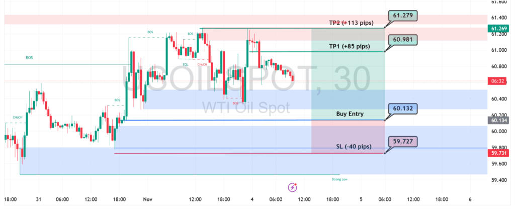 Opini teknikal saat ini sangat bullish untuk USOIL selama level SL mampu bertahan. Zona $60.132 berfungsi sebagai springboard potensial, di mana likuiditas baru diharapkan masuk. Jika pembeli berhasil mempertahankan level ini, kita akan melihat pergerakan harga kembali menguji resistance tertinggi sebelumnya. Namun, penembusan di bawah $59.727 akan membatalkan skenario ini dan membuka peluang bagi tekanan jual.