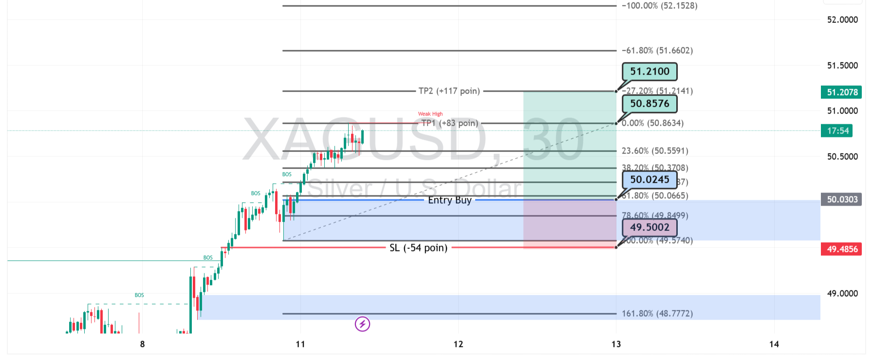 Skenario terbaik terlihat pada area $50.02 sebagai titik entry buy potensial jika terjadi koreksi ringan. Zona ini berdekatan dengan area Fibonacci 38,2% hingga 61,8%, yang sering menjadi titik pantulan harga. Stop loss ideal berada di sekitar $49.50, menjaga risiko tetap terukur jika terjadi pembalikan arah mendadak.