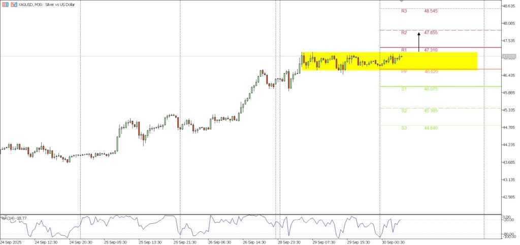 Harga perak (XAG/USD) pada grafik M30 terlihat bergerak sideways dalam area konsolidasi sempit di sekitar $47,00 setelah reli tajam sebelumnya. Level support terdekat berada di pivot $46,62, sementara resistance kunci berada di $47,31 yang juga bertepatan dengan R1. Arah pergerakan selanjutnya diperkirakan bergantung pada kemampuan harga menembus salah satu batas area tersebut.
