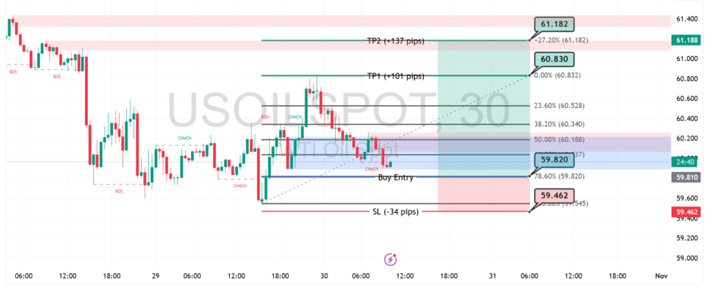 Harga minyak (USOIL) mulai menunjukkan tanda pemulihan setelah membentuk Change of Character (ChoCH) di area support kuat sekitar 59.800. Pola ini menandakan potensi pembalikan arah dari tren turun menuju penguatan jangka pendek. Area tersebut kini menjadi zona ideal untuk posisi beli dengan batas bawah yang jelas di sekitar 59.460 sebagai stop loss.