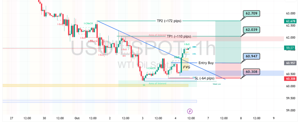 Harga minyak mentah WTI kembali bergerak naik setelah menembus garis tren turun, menandakan adanya potensi pembalikan arah menuju fase bullish jangka pendek. Level $60,3 menjadi area penting yang kini berfungsi sebagai support utama, sementara area $60,9 menjadi titik konfirmasi pembelian jika harga mampu bertahan di atasnya. Momentum beli semakin kuat setelah terbentuknya pola Break of Structure (BoS) yang menunjukkan dominasi pembeli mulai meningkat.