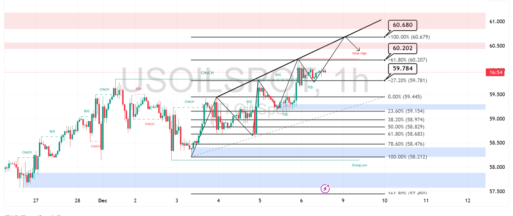 Dalam jangka pendek, minyak berpotensi melanjutkan reli menuju level kunci 59.78, sebelum menguji resistance lebih tinggi di 60.20. Level ini menjadi area penting karena berada di zona premium dan berdekatan dengan batas struktur yang sering memicu reaksi seller. Jika momentum bullish cukup kuat untuk menembusnya, target berikutnya mengarah ke 60.68 yang menjadi magnet harga sekaligus area ekstrem bagi potensi pembalikan.