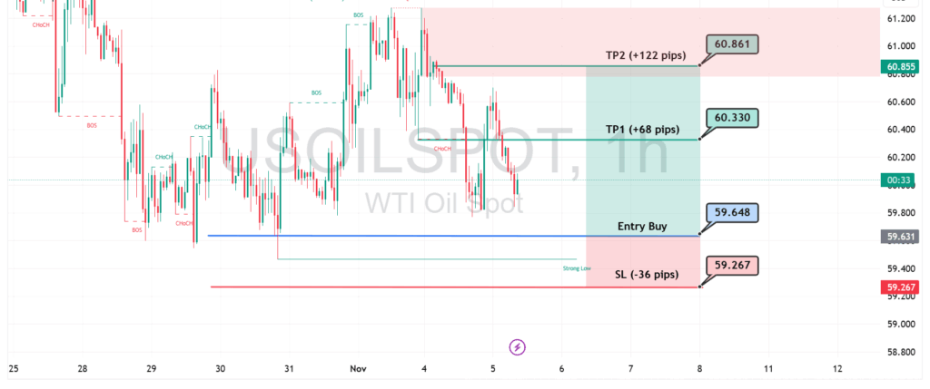 Peluang buy terbuka dengan target pertama (TP1) di 60.33 USD dan target kedua (TP2) di 60.86 USD. Jika harga berhasil menembus area resistance di sekitar 60 USD, momentum bullish kemungkinan akan berlanjut menuju area supply di atas 61 USD. Namun, jika harga kembali melemah dan turun di bawah level stop loss (SL) di 59.26 USD, maka potensi penurunan lanjutan bisa terjadi.