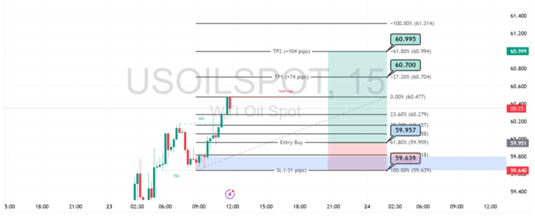 Harga minyak mentah WTI terus menunjukkan kekuatan beli setelah berhasil menembus struktur Break of Structure (BOS) di area 60.47. Pola kenaikan ini