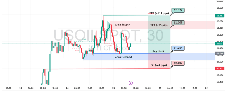 Harga minyak mentah (USOIL) menunjukkan peluang pemulihan setelah menyentuh area demand di sekitar $61.254. Jika tekanan beli meningkat, harga berpotensi naik menuju