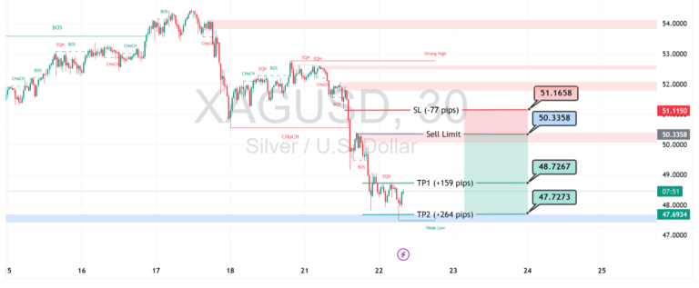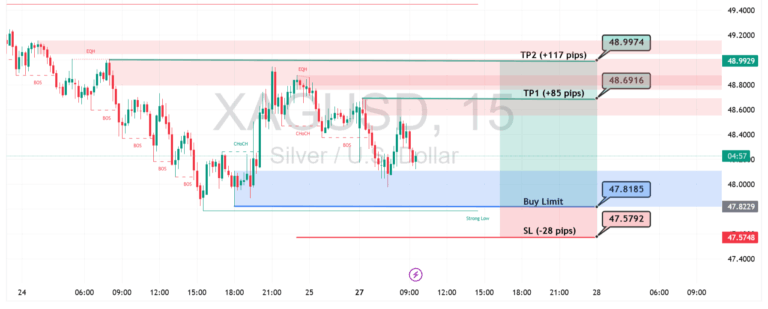 Harga perak (XAGUSD) berpotensi menguat setelah menguji area demand di sekitar $47.818. Jika harga mampu bertahan di atas level ini, peluang menuju