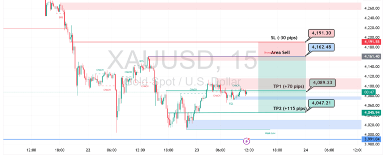 Pergerakan XAUUSD pada time frame 15 menit menunjukkan fase konsolidasi setelah penurunan tajam. Area Strong Sell di sekitar 4.162 menjadi kunci, dengan