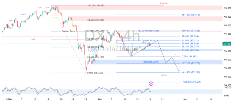 Indeks Dolar AS (DXY) timeframe 4 jam menunjukkan harga sedang bergerak dalam fase konsolidasi setelah gagal menembus area resistance kuat di sekitar