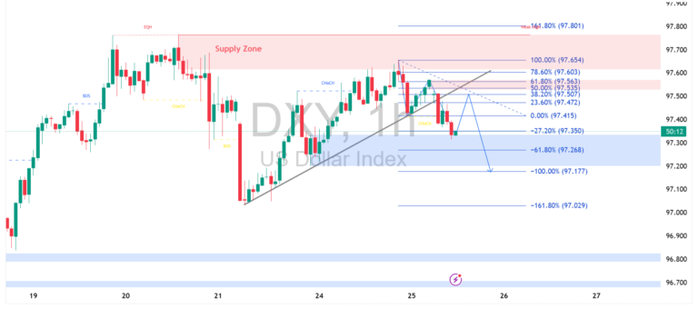 Pergerakan DXY (US Dollar Index) pada timeframe H1 menunjukkan tekanan jual setelah gagal menembus area supply di sekitar 97.60 – 97.80. Harga