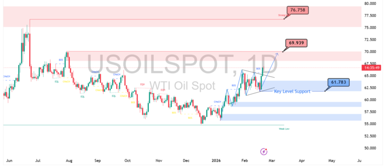Harga WTI Oil (USOIL) menunjukkan perubahan struktur dari bearish ke bullish setelah serangkaian break of structure (BOS) dan change of character (CHoCH)