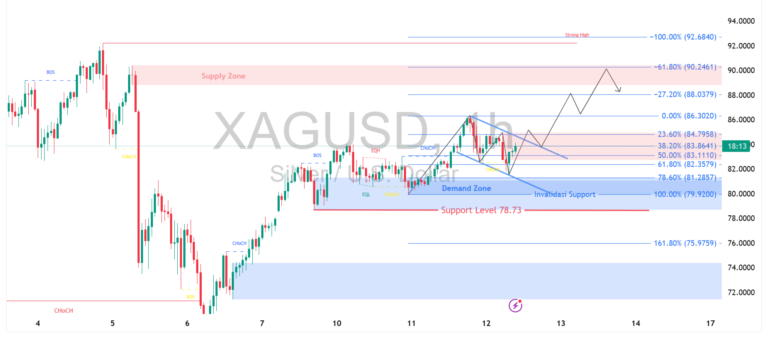 Pergerakan XAGUSD timeframe 4 jam menunjukkan harga tertahan setelah penurunan dari zona supply 86.30 dan kini berkonsolidasi di sekitar area Fibonacci 50%.