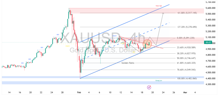 Secara teknikal, XAUUSD pada timeframe 4 jam masih bergerak dalam struktur naik setelah membentuk channel bullish sejak awal Februari. Harga saat ini