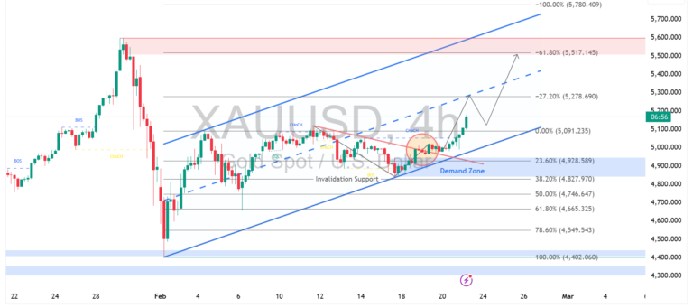 Pergerakan XAUUSD pada timeframe 4 jam menunjukkan tren naik yang mulai menguat setelah harga berhasil bertahan di atas area demand 4.900 –