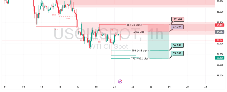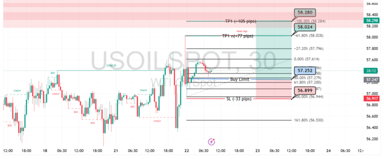 Harga minyak mentah WTI (USOIL) saat ini menunjukkan tanda-tanda konsolidasi setelah penurunan singkat menuju area Buy Limit di sekitar 57.25. Struktur pasar