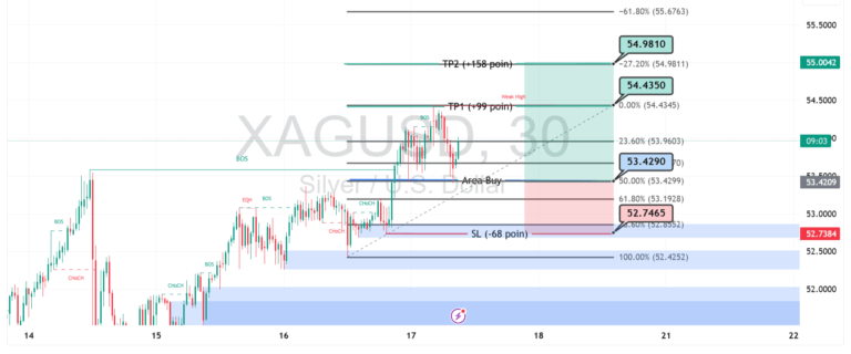 Harga perak (XAG/USD) menunjukkan potensi penguatan setelah terkoreksi ringan menuju zona beli di sekitar $53,42. Struktur pasar pada grafik 30 menit memperlihatkan