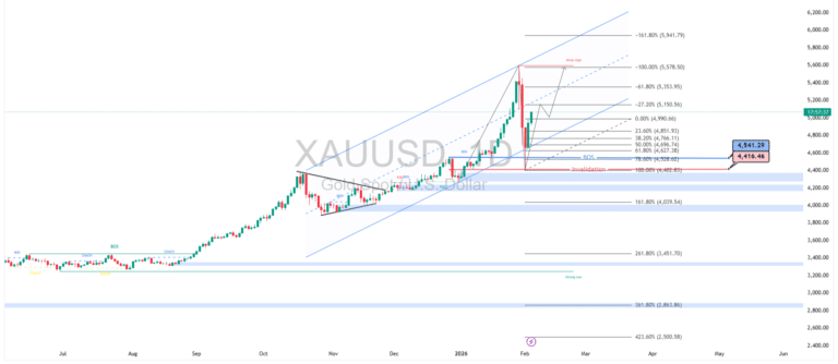 Pergerakan XAUUSD pada timeframe harian masih berada dalam tren naik jangka menengah meski sempat mengalami koreksi tajam dari area puncak. Struktur harga