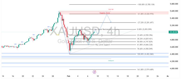 Pergerakan XAUUSD timeframe empat jam menunjukkan pemulihan bertahap setelah membentuk titik rendah kuat di area bawah dan memantul dari zona support utama.