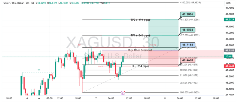 Harga perak (XAG/USD) menunjukkan potensi kenaikan kuat setelah menembus area konsolidasi dan mengonfirmasi sinyal Buy After Breakout di kisaran $48.71. Struktur pasar