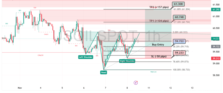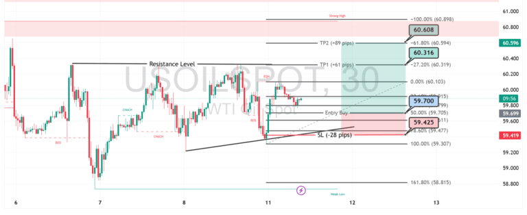 Harga minyak WTI (USOIL) terlihat berupaya bangkit setelah menemukan support kuat di sekitar $59.40 dan kini bergerak mendekati area $59.70. Struktur harga