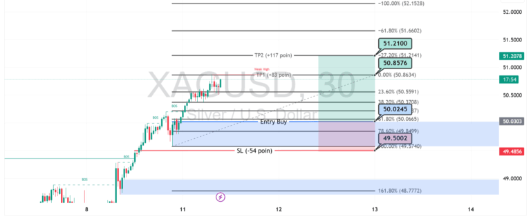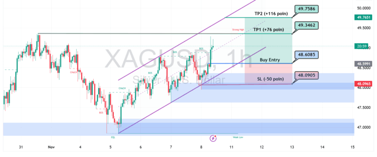 Harga perak (XAGUSD) berpotensi melanjutkan penguatan setelah berhasil bertahan di atas area buy zone di sekitar $48,10. Rebound dari area ini menunjukkan