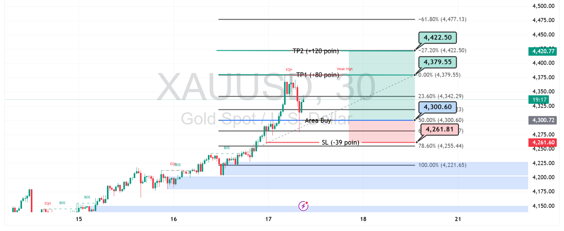 Kenaikan emas ini juga mendapat dorongan dari ekspektasi pemangkasan suku bunga The Fed yang menekan imbal hasil obligasi AS, serta meningkatnya permintaan terhadap aset aman di tengah ketidakpastian ekonomi global. Level take profit (TP1) di $4.379 menjadi area konfirmasi penting, di mana penembusan di atasnya berpotensi membuka jalan menuju target berikutnya di $4.422.