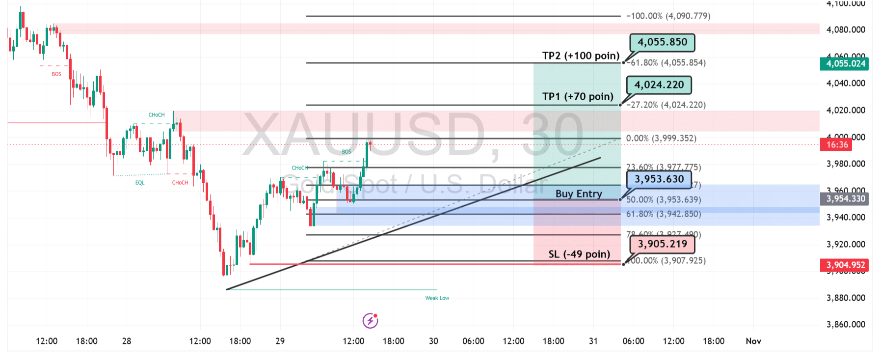 Jika tekanan beli terus berlanjut, target pertama (TP1) berada di area 4.024, dengan target lanjutan (TP2) menuju 4.055. Keduanya mencerminkan potensi profit sekitar 70–100 poin dari level entry. Struktur harga juga ditopang oleh tren naik jangka pendek (ascending trendline), yang memperkuat peluang pembalikan dari zona demand biru.