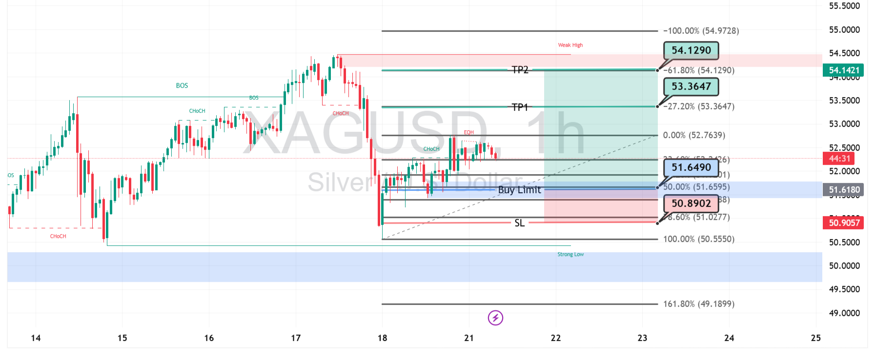 Dari sisi teknikal, pola pergerakan harga memperlihatkan tanda-tanda pemulihan bertahap, dengan konfirmasi Change of Character (ChoCH) yang menunjukkan potensi perubahan tren. Target kenaikan jangka pendek berada di area take profit 1 $53,36, sementara take profit 2 di $54,12 menjadi sasaran berikutnya jika momentum bullish berlanjut. Kenaikan ini bisa semakin kuat apabila tekanan dolar AS mulai mereda dan minat investor terhadap logam mulia meningkat.