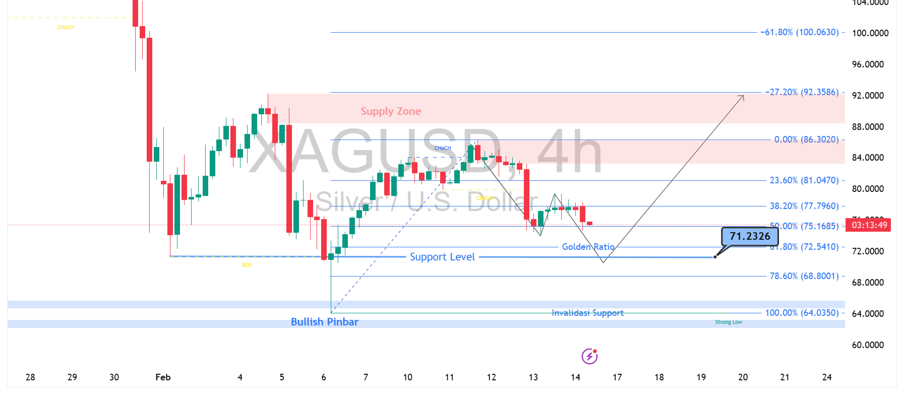 Namun skenario bullish akan gugur jika harga menembus bawah 64.00 sebagai support invalidasi. Penurunan di bawah zona tersebut dapat membuka ruang pelemahan lebih dalam sekaligus mengubah bias jangka menengah kembali bearish.