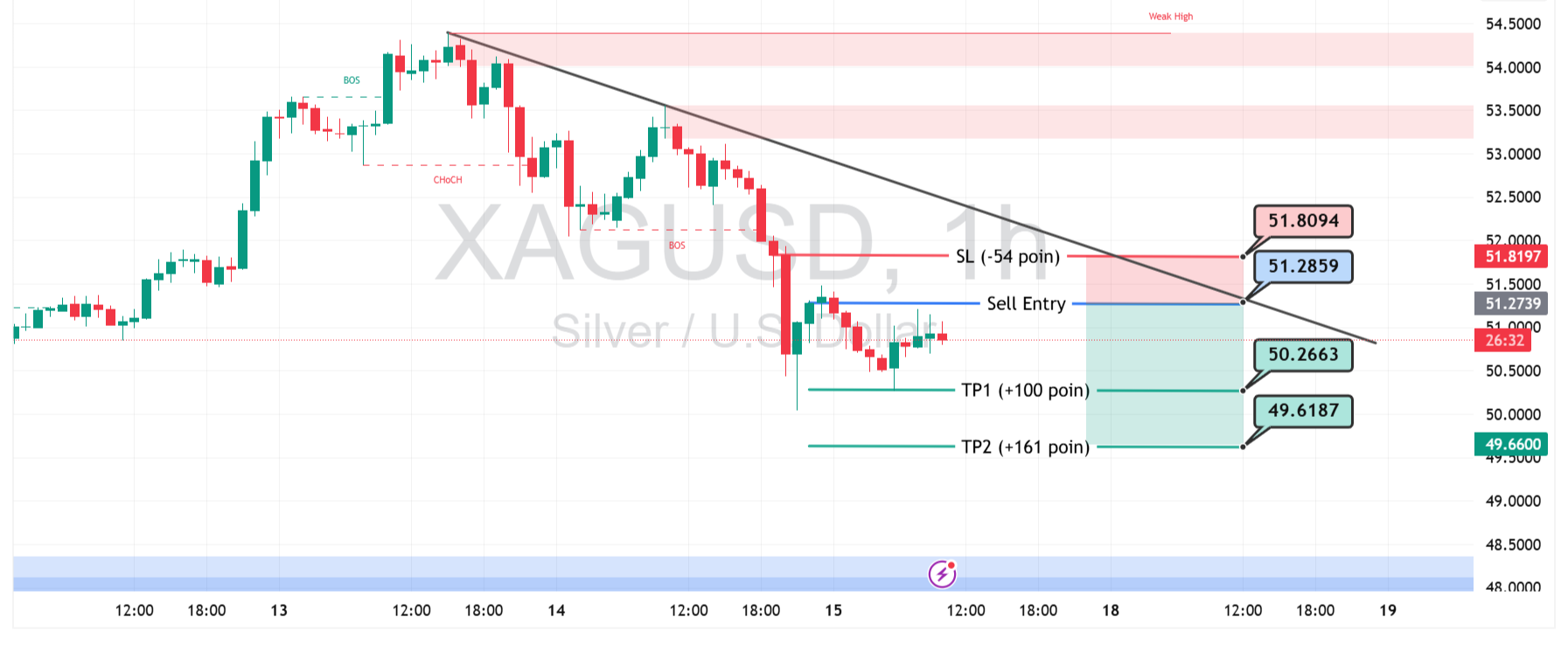Harga perak (XAGUSD) masih berada dalam tekanan turun setelah gagal menembus trendline bearish di area 51.28 – 51.30. Zona ini menjadi resistance kuat yang sering menahan kenaikan sehingga peluang penurunan kembali terbuka. Struktur pasar juga menunjukkan serangkaian penurunan yang konsisten setelah beberapa kali Break of Structure (BOS).