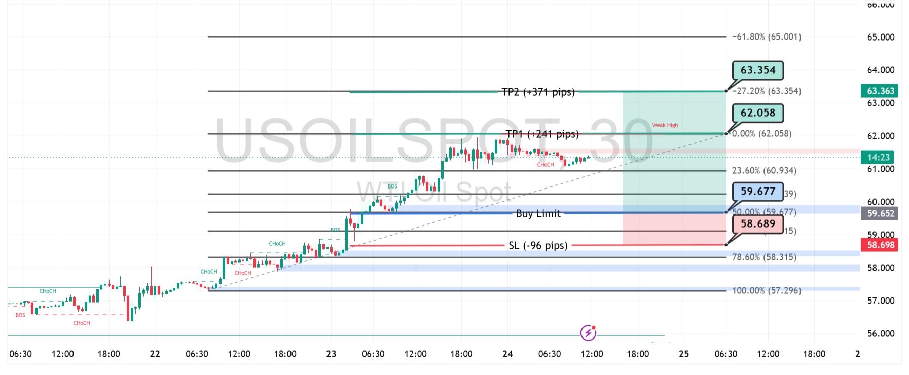Zona Buy Limit di kisaran $59,67 hingga $58,68 menjadi area penting yang dipantau pelaku pasar, karena area ini berpotensi menjadi titik re-entry bagi buyer jika terjadi koreksi sehat. Jika harga mampu bertahan di atas zona tersebut dan menembus kembali level $62,05, peluang menuju target berikutnya di sekitar $63,35 akan semakin terbuka.
