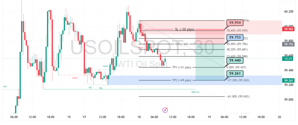 Harga USOIL di time frame 30 menit menunjukkan tekanan turun setelah munculnya pola Change of Character di area 59.90 – 60.00. Penolakan kuat di zona tersebut menandakan buyer mulai melemah, sementara seller mengendalikan arah pergerakan.