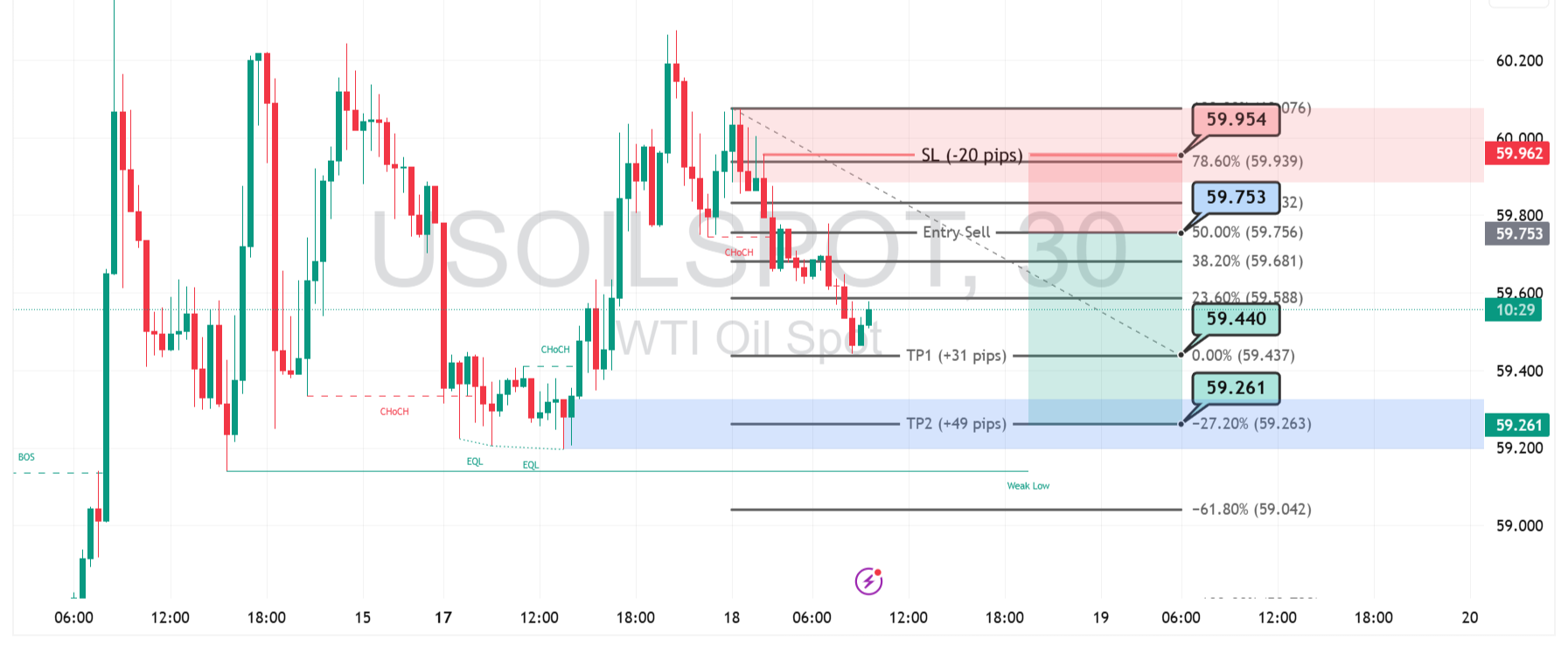 Area 59.75 menjadi titik entry sell yang sejalan dengan retracement Fibonacci 50%. Selama harga tidak naik melewati level itu, potensi turun menuju 59.44 dan kemudian 59.26 tetap terbuka, mengikuti struktur lower high dan lower low yang terbentuk.
