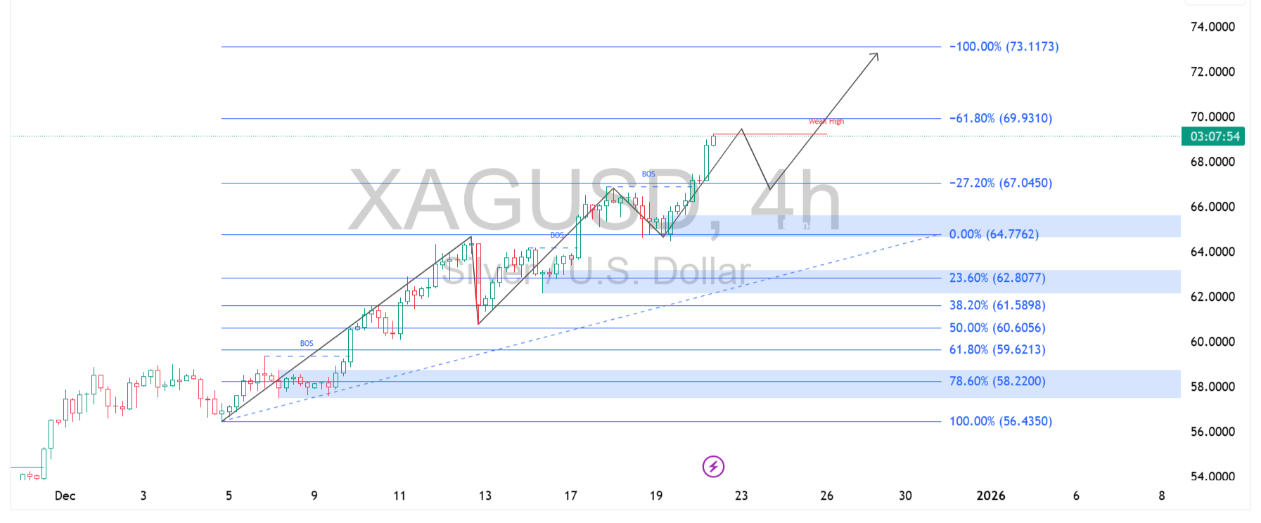 Harga perak (XAGUSD) pada time frame H4 masih bergerak dalam tren naik yang solid, ditopang oleh rangkaian higher high dan higher low. Struktur pasar menunjukkan break of structure (BOS) bullish yang menegaskan dominasi buyer. Selama harga bertahan di atas area kunci, sentimen teknikal tetap mengarah ke penguatan lanjutan menuju level psikologis yang lebih tinggi.