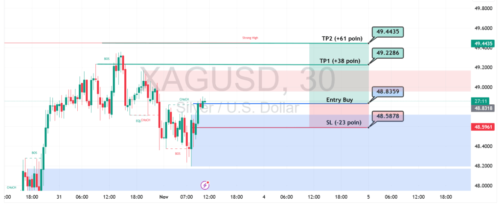 Harga perak (XAGUSD) menunjukkan tanda pemulihan setelah menemukan dukungan kuat di area $48,58, yang kini menjadi zona entry buy potensial. Pola Change of Character (ChoCH) yang terbentuk mengindikasikan perubahan arah dari tren turun menuju penguatan baru. Jika harga mampu bertahan di atas area ini, peluang untuk melanjutkan kenaikan terbuka lebar.