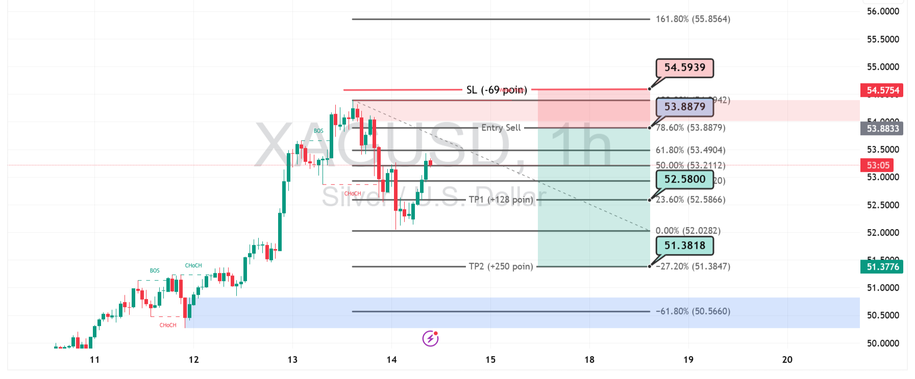 Harga perak (XAGUSD) mulai melemah setelah gagal menembus area premium di sekitar level 53.8879, yang menjadi titik masuk ideal bagi seller. Penolakan kuat di zona Fibonacci 78,6% dan munculnya ChoCH pada timeframe 1 jam mengonfirmasi perubahan arah ke tren turun.
