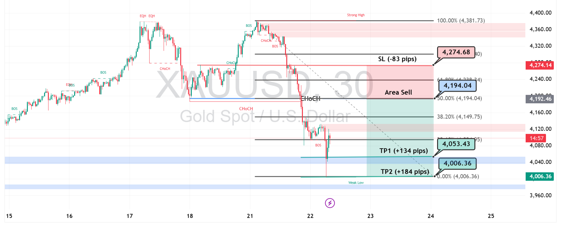 Area sell zone di kisaran 4.194 diperkirakan menjadi titik pantulan potensial jika harga melakukan retracement ke area tersebut. Level ini juga bertepatan dengan Fibonacci retracement 50–61.8%, menjadikannya area ideal bagi pelaku pasar untuk mencari peluang short position dengan target profit di sekitar 4.053 (TP1) dan 4.006 (TP2). Stop loss disarankan di atas 4.274 untuk menjaga rasio risiko dan imbal hasil tetap seimbang.
