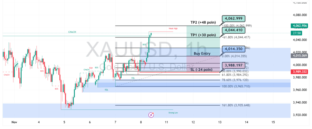 Arah pergerakan emas kini mengarah menuju TP1 di $4.044 dan TP2 di $4.063, yang menjadi area potensial untuk ambil profit jangka pendek. Struktur pasar memperlihatkan pola higher high dan higher low yang jelas, memperkuat tren naik di tengah ekspektasi pelonggaran tekanan dolar AS dan meningkatnya minat terhadap aset safe haven.