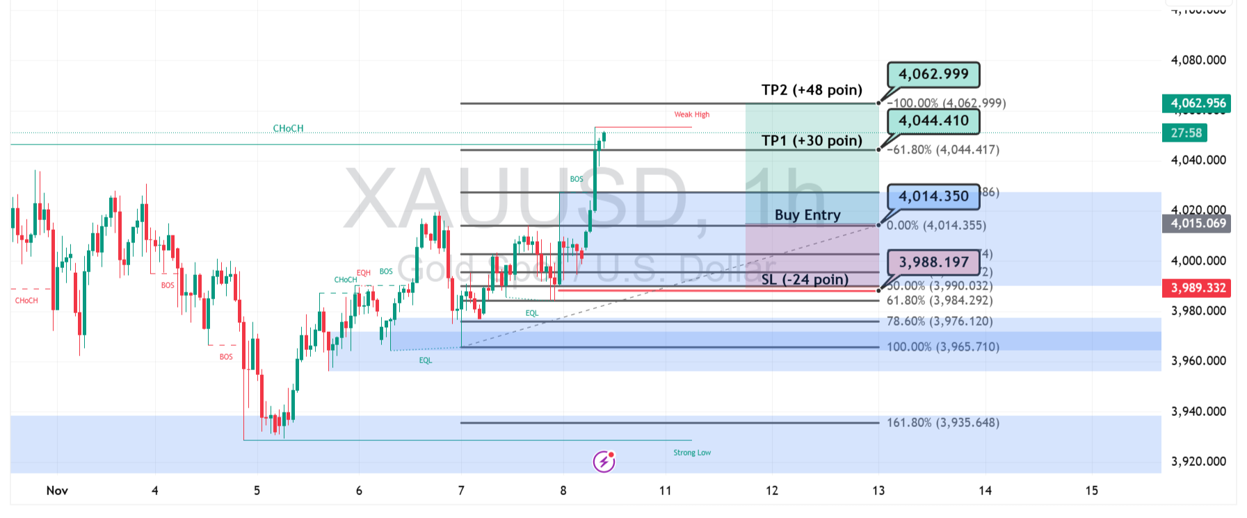 Harga emas (XAUUSD) melanjutkan reli kuat setelah menembus area konsolidasi dan mencetak Break of Structure (BOS) pada grafik 1 jam, menandakan dominasi buyer semakin solid. Momentum positif ini terbentuk setelah harga bertahan di atas zona Buy Entry $4.014, dengan area Stop Loss di $3.988 sebagai batas aman jika terjadi koreksi.