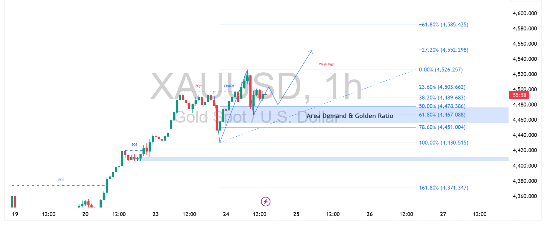 Dari sisi Fibonacci retracement, area krusial berada pada zona 50% – 61,8% yang bertepatan dengan area demand & golden ratio di kisaran 4.467 – 4.478. Zona ini menjadi titik reaksi penting bagi buyer untuk mempertahankan dominasi. Reaksi bullish dari area tersebut membuka peluang harga kembali menguji level 0% Fibonacci di sekitar 4.526 sebagai target terdekat.