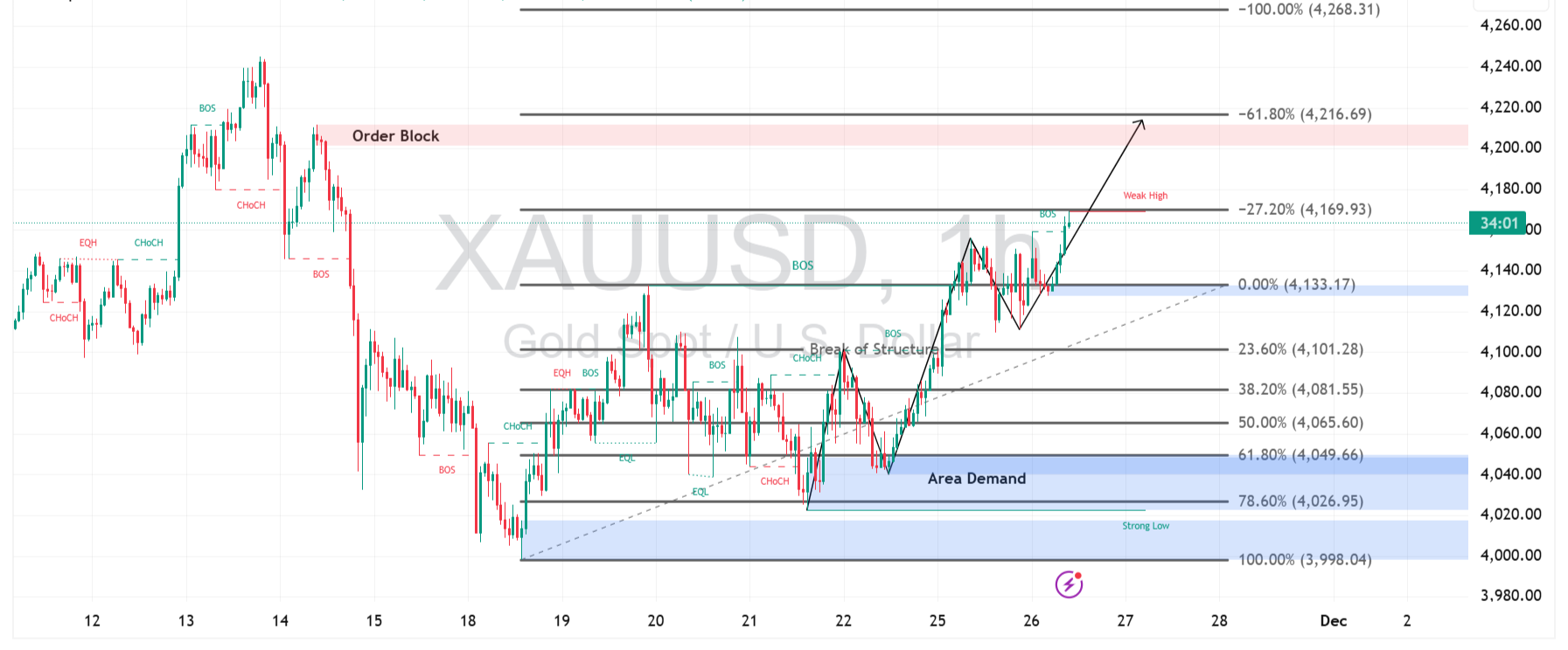 Saat ini XAUUSD bergerak mendekati zona weak high, membuka peluang bagi pembeli untuk mendorong harga menuju target berikutnya di area order block 4.200 – 4.220. Struktur kenaikan yang rapi, disertai serangkaian BOS (Break of Structure), memperkuat ekspektasi bahwa tren naik masih memiliki ruang lanjutan selama harga mampu bertahan di atas level 4.130.