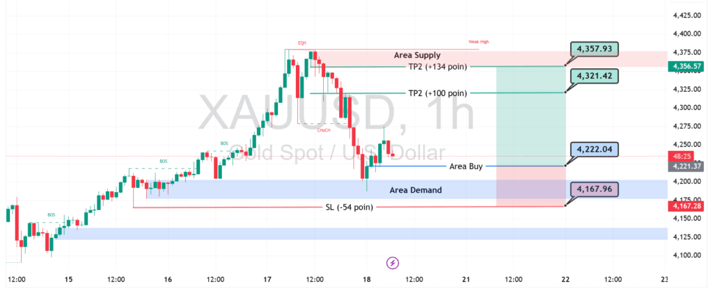 Selama harga bertahan di atas area demand, bias jangka pendek masih cenderung positif. Sebaliknya, jika XAU/USD menembus di bawah 4.167, tekanan jual bisa kembali mendominasi dan membuka peluang koreksi lebih dalam. Dengan rasio risiko terhadap imbal hasil yang menarik, skenario buy dari area ini tetap menjadi opsi strategis bagi pelaku pasar yang mencari peluang di tengah fluktuasi harga emas.